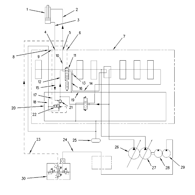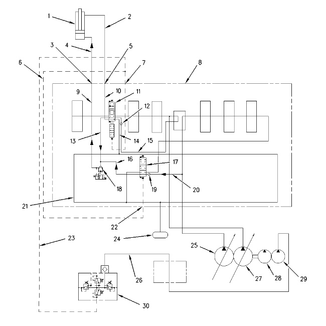 (1) Boom cylinder (2) Line (3) Port (4) Line (5) Port (6) Pilot Line (7) Port (8) Main control valve (9) Passage (10) Passage (11) Boom I control valve (12) Load check valve (13) Passage (14) Passage (15) Parallel feeder passage (16) Passage (17) Boom II control valve (18) Boom drift reduction valve (19) Check valve (20) Parallel feeder passage (21) Return passage (22) Port (23) Line (24) Hydraulic oil tank (25) Right pump (26) Line (27) Left pump (28) Blade pump (29) Pilot pump (30) Pilot control valve (bucket and boom) |