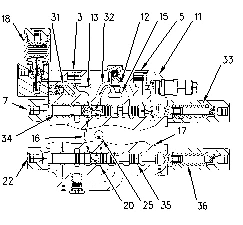 Boom I control valve (BOOM RAISE) (3) Port (5) Port (7) Port (11) Boom I control valve (12) Load check valve (13) Passage (15) Parallel feeder passage (16) Passage (17) Boom II control valve (18) Boom drift reduction valve (20) Parallel feeder passage (22) Port (25) Right Pump (31) Valve (32) Passage (33) Spring (34) Stem (35) Stem (36) Spring |