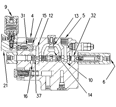 Boom I control valve (BOOM LOWER) (4) Port (5) Port (6) Port (9) Port (10) Passage (12) Passage (13) Load check valve (14) Parallel feeder passage (15) Passage (16) Return passage (21) Boom drift reduction valve (31) Valve (32) Stem (37) Passage |