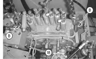 1. Install Tooling (B). Use a suitable lifting device to remove the control valve. The approximate weight of the control valve is 91 kg (200 lb). Remove four bolts (18) .
