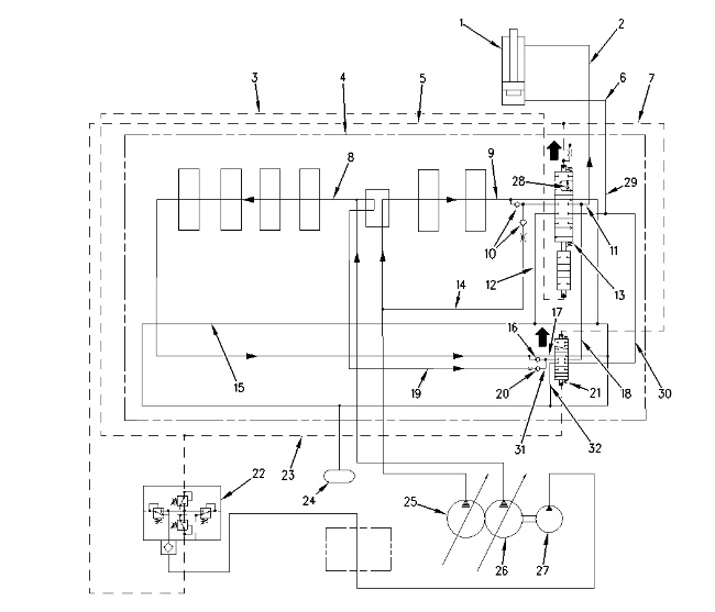 (1) Stick cylinder (2) Line (3) Pilot line (4) Main control valve (5) Pilot line (6) Line (7) Pilot line (8) Center bypass passage (9) Center bypass passage (10) Load check valves (11) Passage (12) Passage (13) Stick I control valve (14) Parallel feeder passage (15) Return passage (16) Load check valve (17) Passage (18) Passage (19) Parallel feeder passage (20) Load check valve (21) Stick II control valve (22) Pilot control valve (swing and stick) (23) Pilot line (24) Hydraulic oil tank (25) Right pump (26) Left pump (27) Pilot pump (28) Check valve (29) Passage (30) Passage (31) Passage (32) Return passage |