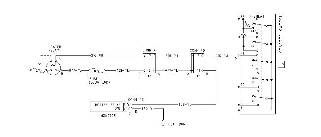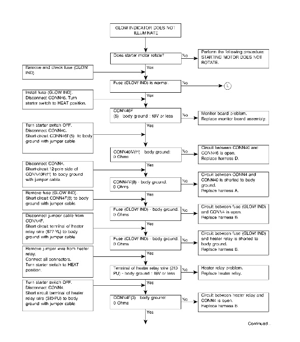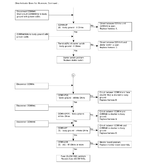 Solution: Check that the following connectors and components are connected properly: starter switch, heater relay, “CONN 4”, “CONN 40” and “CONN 46”. If the problem still exists, use the following procedure to troubleshoot the system.