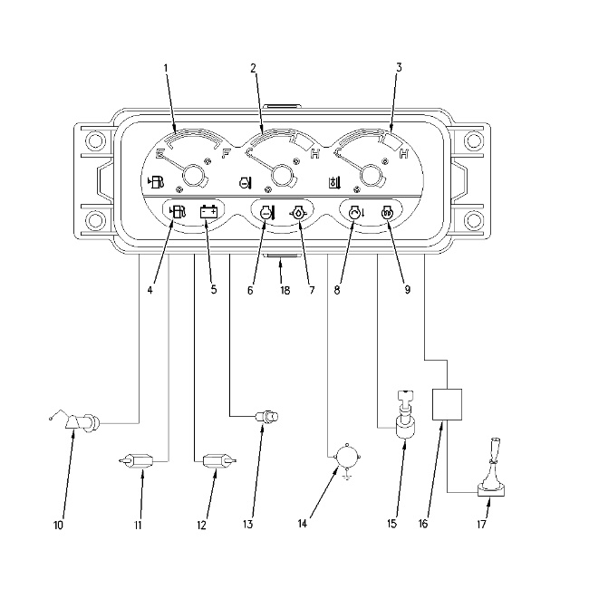 Inputs and Outputs for the Monitoring System (1) Fuel level gauge (2) Engine coolant temperature gauge (3) Hydraulic oil temperature gauge (4) Low fuel level indicator (5) Indicator for battery charge (6) Indicator for engine coolant temperature (7) Indicator for low engine oil pressure (8) Low idle indicator (9) Glow indicator (10) Fuel level sensor (11) Engine coolant temperature sensor (12) Hydraulic oil temperature sensor (13) Engine oil pressure switch (14) Alternator (15) Key start switch (16) Controller (17) Switch for one touch low idle (18) Monitor panel |