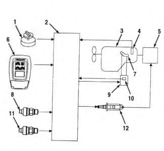 Diagram of Inputs and Outputs for Engine and Pump Regulation Models 312C through 322C (1) Engine speed dial (2) Engine and Pump Controller (3) Engine (4) Speed Sensor (5) Pump (6) Monitor (7) Governor lever (8) Hydraulic pump pressure sensor (right) (9) Governor actuator (10) Feedback sensor (11) Hydraulic pump pressure sensor (left) (12) Proportional reducing valve |