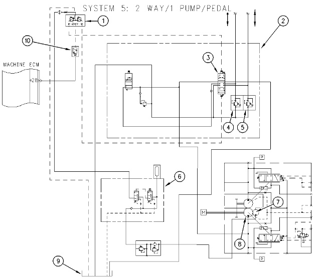 (1) Foot valve for work tool (2) Main control valve (3) Attachment control valve (4) Line relief valve (5) Line relief valve (6) Pilot manifold (7) Pilot pump (8) Drive pump (9) Hydraulic tank (10) Work tool pressure switch for the attachment control valve |