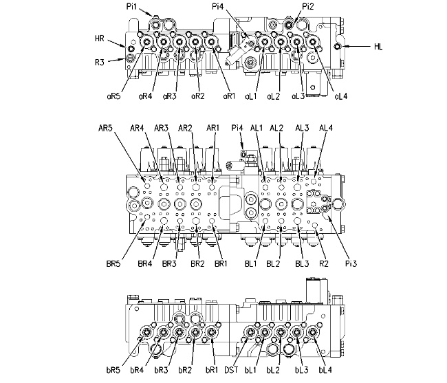 Main control valve ports (AR1) Right travel control valve (REVERSE TRAVEL) (AR2) Attachment control valve (port) (AR3) Bucket control valve (BUCKET CLOSE) (AR4) Boom I control valve (BOOM LOWER) (AR5) Stick II control valve (STICK IN) (BR1) Right travel control valve (FORWARD TRAVEL) (BR2) Attachment control valve (port) (BR3) Bucket control valve (BUCKET OPEN) (BR4) Boom I control valve (BOOM RAISE) (BR5) Stick II control valve (STICK OUT) (AL1) Left travel control (REVERSE TRAVEL) (AL2) Swing control valve (SWING LEFT) (AL3) Stick I control valve (STICK IN) (AL4) Boom II control valve (BOOM RAISE) (BL1) Left travel control valve (FORWARD TRAVEL) (BL2) Swing control valve (SWING RIGHT) (BL3) Stick I control valve (STICK OUT) (aR1) Pilot port at right travel control valve (REVERSE TRAVEL) (aR2) Pilot port at attachment control valve (aR3) Pilot port at bucket control valve (BUCKET CLOSE) (aR4) Pilot port at boom I control valve (BOOM LOWER) (aR5) Pilot port at stick II control valve (STICK IN) (aL1) Pilot port at left travel control valve (REVERSE TRAVEL) (aL2) Pilot port at swing control valve (SWING LEFT) (aL3) Pilot port at stick I control valve (STICK IN) (aL4) Pilot port at boom II control valve (BOOM RAISE) (bR1) Pilot port at right travel control valve (FORWARD TRAVEL) (bR2) Pilot port at attachment control valve (bR3) Pilot port at bucket control valve (BUCKET OPEN) (bR4) Pilot port at boom I control valve (BOOM RAISE) (bR5) Pilot port at stick II control valve (STICK OUT) (bL1) Pilot port at left travel control valve (FORWARD TRAVEL) (bL2) Pilot port at swing control valve (SWING RIGHT) (bL3) Pilot port at stick I control valve (STICK OUT) (bL4) Pilot port at boom II control valve (STICK IN) (DST) Drain port (straight travel control valve) (HL) Negative flow signal pressure port (left pump) (HR) Negative flow signal pressure port (right pump) (Pi1) Pilot port (boom regeneration valve) (Pi2) Pilot port (stick regeneration valve) (Pi3) Pilot port (variable swing priority valve) (Pi4) Pilot port (straight travel solenoid valve) (R2) Return port (R3) Return port |