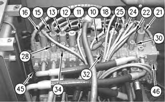 (10) Straight travel solenoid valve (11) Right travel control valve (12) Attachment control valve (13) Bucket control valve (15) Boom I control valve (16) Stick II control valve (18) Straight travel control valve (21) Boom II control valve (22) Stick I control valve (24) Swing control valve (25) Left travel control valve (28) Line relief valve (boom cylinder rod end) (30) Line relief valve (stick cylinder head end) (32) Main relief valve (34) Line relief valve (bucket cylinder rod end) (45) Right body (46) Left body |