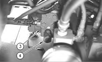 Main control valve (bottom view) (3) Boom drift reduction valve (4) Line relief valve (boom cylinder head end) |