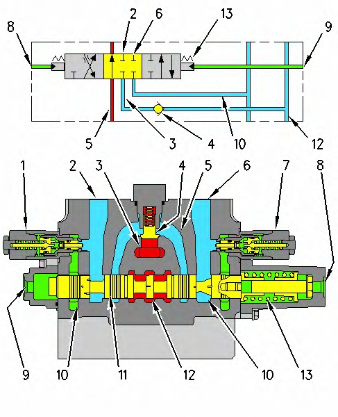 When the joysticks and/or travel levers/pedals are in the NEUTRAL position, pilot oil does not flow to port (8) and port (9). Spool (11) is centered in the NEUTRAL position by the force of spring (13). The right pump oil flows through center bypass passage (12) to the hydraulic tank.
