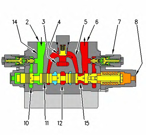 Bucket control valve BUCKET CLOSE (2) Port (3) Parallel feeder passage (4) Load check valve (5) Passage (6) Port (8) Pilot port (10) Return passage (11) Spool (12) Center bypass passage (14) Passage (15) Passage |