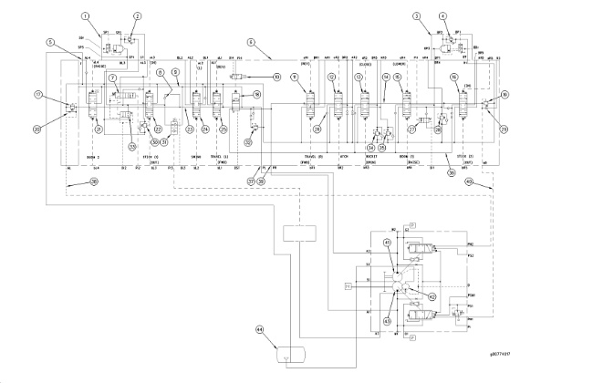 Hydraulic schematic (1) Stick drift reduction valve (2) Line relief valve (stick cylinder rod end) (3) Boom drift reduction valve (4) Line relief valve (boom cylinder head end) (5) Return port (6) Main control valve (7) Stick regeneration valve (8) Load check valve (9) Parallel feeder passage (10) Straight travel solenoid valve (11) Right travel control valve (12) Attachment control valve (13) Bucket control valve (14) Center bypass passage (15) Boom I control valve (16) Stick II control valve (17) Relief valve (negative flow) (18) Straight travel control valve (19) Relief valve (negative flow) (20) Negative flow control orifice (21) Boom II control valve (22) Stick I control valve (23) Center bypass passage (24) Swing control valve (25) Left travel control valve (26) Load check valve (27) Boom regeneration valve (28) Line relief valve (boom cylinder rod end) (29) Negative flow control orifice (30) Line relief valve (stick cylinder head end) (31) Variable swing priority valve (32) Main relief valve (33) Stick unloading valve (34) Line relief valve (bucket cylinder rod end) (35) Line relief valve (bucket cylinder head end) (36) Parallel feeder passage (37) Inlet port (left pump) (38) Negative flow control line (left pump) (39) Inlet port (right pump) (40) Negative flow control line (right pump) (41) Left pump (42) Pilot pump (43) Right pump (44) Hydraulic tank |