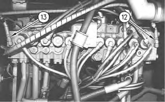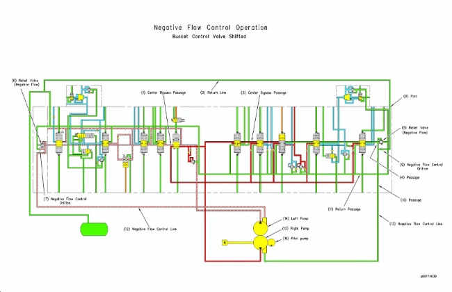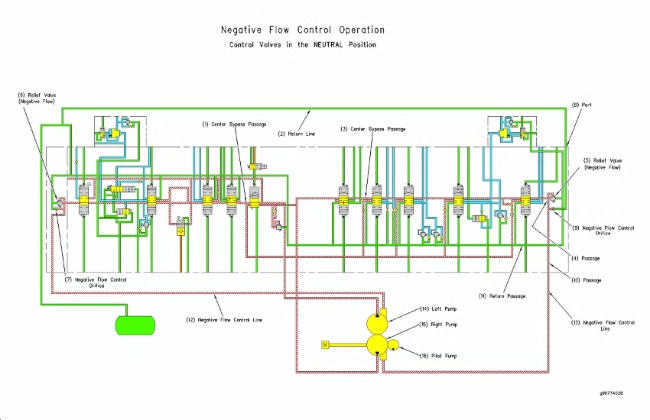 The right body of the control valve receives supply oil from the right pump. Negative flow control pressure from the right body of the main control valve flows through negative flow control line (13) to the right pump. The left body of the control valve receives supply oil from the left pump. Negative flow control pressure from the left body of the main control valve flows through negative flow control line (12) to the left pump. The negative flow control operation of the right pump and the left pump is identical.