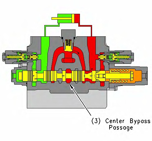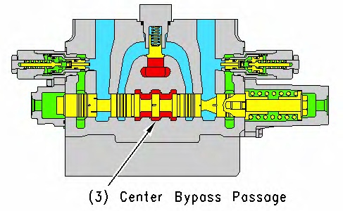 Illustration 2 shows the negative flow control operation at the main control valve when all of the control valves are in the NEUTRAL position. When all of the joysticks and the travel levers/pedals are in the NEUTRAL position, the spools of the individual control valves are in the NEUTRAL position. Oil flow to the cylinders and motors is blocked. Center bypass passages (1) and (3) are open.