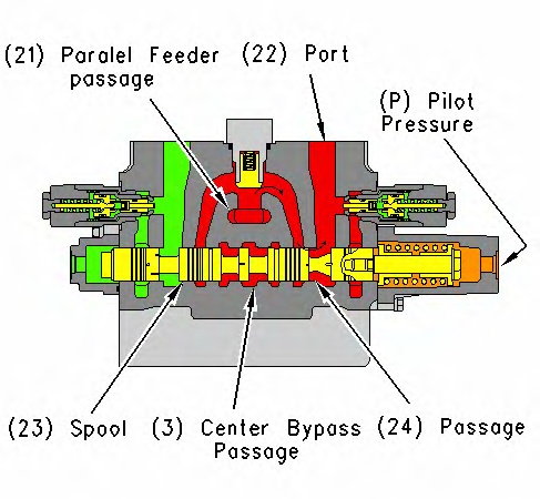 The oil delivery from the right pump is now divided into two flow paths. A portion of the oil delivery from the right pump flows through center bypass passage (3) to negative flow control orifice (9). The remainder of the oil delivery from the right pump flows through parallel feeder passage (21) and passage (24) to port (22). The oil flow from center bypass passage (3) to negative flow control orifice (9) decreases. The flow resistance through the negative flow control orifice decreases and the negative flow control pressure (PN) in passage (4) decreases. The negative flow control pressure that is sent to the regulator at the right pump decreases. The pump regulator causes the swashplate of the right pump to move toward the maximum angle position. The output flow of the pump is increased due to the decrease in negative flow control pressure (PN) .