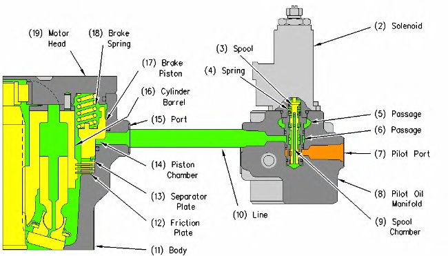 Swing parking brake (disengaged position) (2) Swing parking brake solenoid valve (3) Spool (4) Spring (5) Passage (6) Passage (7) Port (pilot system oil) (8) Pilot oil manifold (9) Spool chamber (10) Line (11) Body (swing motor) (12) Friction plate (13) Separator plate (14) Piston chamber (15) Port (swing motor) (16) Cylinder barrel (17) Brake piston (18) Brake spring (19) Motor head |