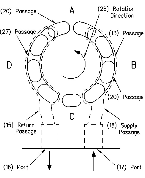 Motor passages (A) Bottom center position (B) Inlet side (high pressure) (C) Top center position (D) Outlet side (low pressure) (13) Passage (valve plate) (15) Return passage (16) Port (17) Port (18) Supply passage (20) Passage (cylinder barrel) (27) Passage (valve plate) (28) Direction of motor rotation (counterclockwise rotation) |