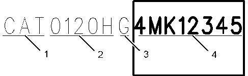 (1) Caterpillars World Manufacturing Code (characters 1 – 3) (2) Machine description (characters 4 – 8) (3) Check character (character 9) (4) Machine Indicator Section (MIS) or Product Sequence Number (characters 10 – 17). These characters were previously referred to as the Serial Number. |