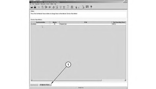In order to perform the “Synchronize Service Hour Meters” function, select the “Service” menu, and “Synchronize Service Hour Meters” from the drop-down menu. When the PL522 or 523 is the master ECM, select the “Set Master Hours” button. Once the master hours have been set, click the”Synchronize” button in order to synchronize any other sync-clock capable/enabled ECM. Refer to Illustration 6.